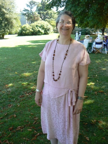 her rose colored dress. It is a wonderful color with her dark hair and she looks very slim. |