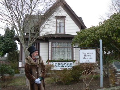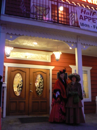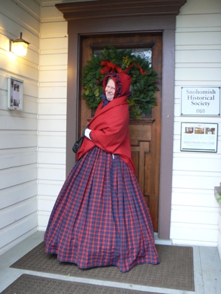 The town of Snohomish is located approximately 1 hour's drive north and east of the city of Seattle. It is quaint, and prides itself on maintaining historical homes, buildings and businesses. The weather on this day was very chilly and frosty, but approximately 20 degrees warmer than it had been for the group just the day before when they visited Leavenworth, Washington where snow lay on the ground. The day began with one load of carpool partners arriving to the Blackman House where we had agreed to check in and gather as a group. Pictured here left is Miss Bobbie at the doorway of the Blackman House, wearing a delightful 1850's era Victorian hoop dress, bright red shawl and festive red bonnet . |