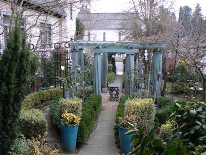 Sir Harry prepares to climb the short rise of stairs to the next home. On the outside, artistically pruned topiary bushes and hedges along with the vignetting of table and chairs on the porch only hinted at what was in store for us inside! |
