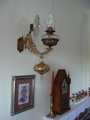 At our next stop, we found a couple who had a number of delightful antique pieces in their home, such as this lantern with reflective mirror. The cute mantle clock is also sweet with the little turned pieces on each end. |