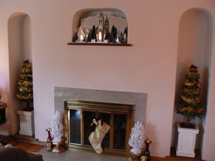 had curved-top niches, drawing one's eye to them. In the top one, the owner had placed a small village of homes which lit up on battery. Symmetrical topiary trees in decorative pots flanked the fireplace, adding to the theme. |