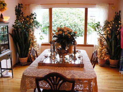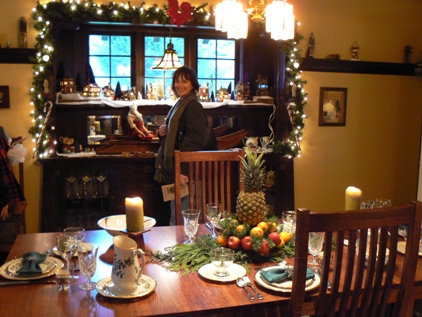 large mirror, outlined by a heavy gold frame. The Duncan Phyfe table and chairs invited one to "Come on over for holiday dinner." So cute. So vintage-chic. Thank you for letting us peek. |