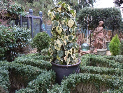 In the garden we'd find statuary, closely trimmed plantings and a garden shed. |
