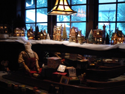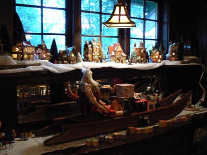 These are the decorations on the sideboard / hutch in the dining room. Looks like Santa is going to arrive via the vintage catamaran. The small lighted houses look sweet on the shelf. | |