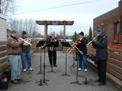 & Sir Harry back downtown. Arriving to a vacant space between buildings, we found a merry group of brass horn performers, providing lively tones for all those present in the audience. As Lady V happened to be wearing a long strand of bells, it was suggested that we all sing "Jingle Bells" while the strand of bells was jiggled in time to the music. Nice! |