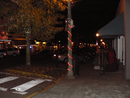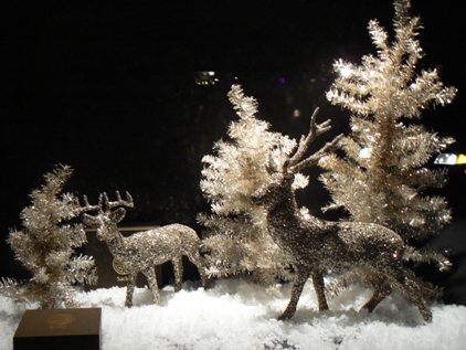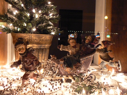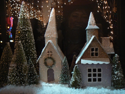 As our party left the restaurant, we strolled past the lovingly decorated windows in this tiny town. The decorations reminded several of us of happy times in our own youth or young adult lives. Flocked houses, bottle-brush trees, shimmering glitter reindeer all evocative of a more family-oriented and slower time in history. Look carefully, you might even spot the reflection of our photographer, Lady Victoria... | |