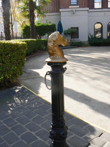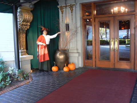 Here, Miss Bobbie strikes a coquettish pose near the front doors of the elegant hotel. |