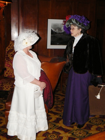 Miss Sharon, now in paisley Eaton jacket, stops by to chat with Miss Loveday (seated) who is wearing a beaded "jet" and lace shawl. |
