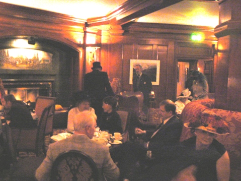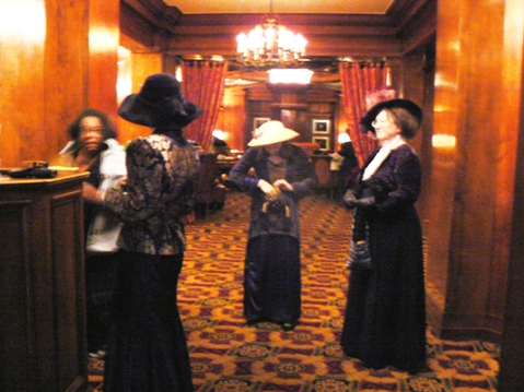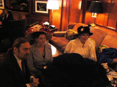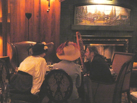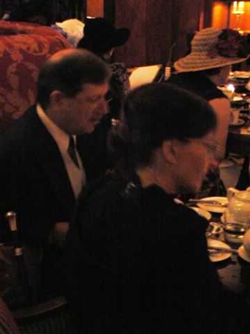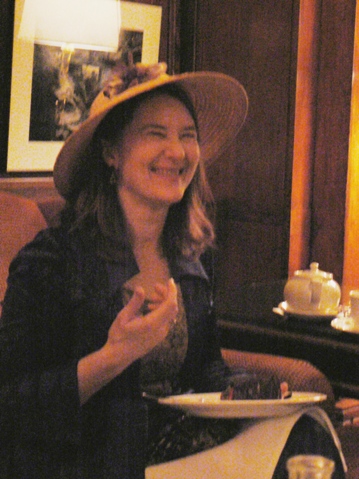 The Cheethams discuss tea varieties. Notice the darling hat with flowers? |