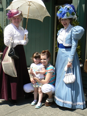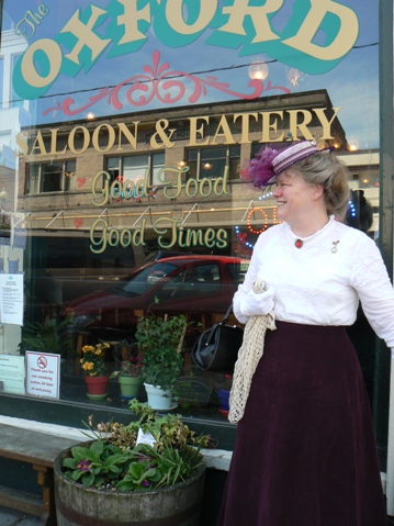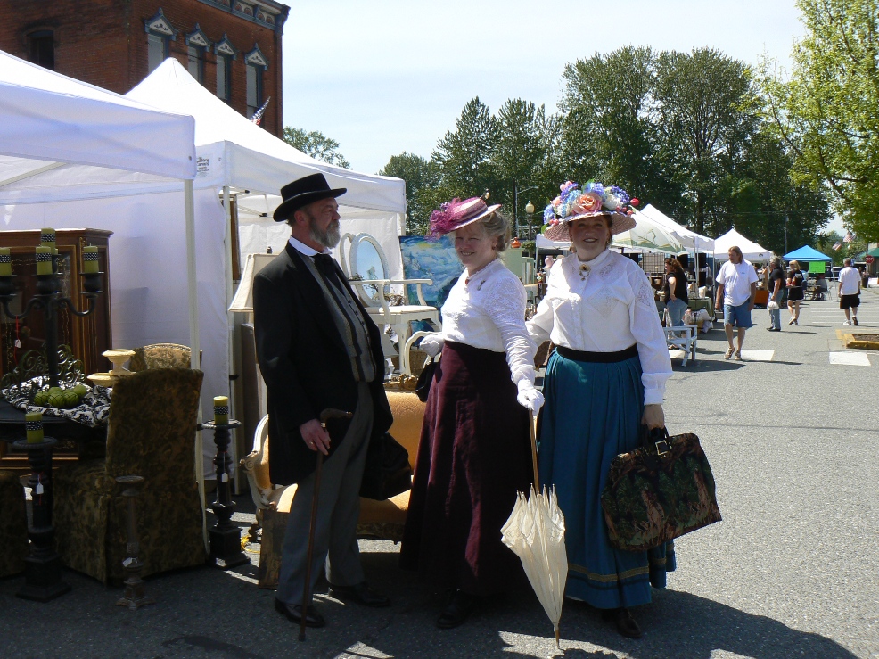 On this day, a few of us traveled north from Seattle to view the "Antique Fair" which was set up down the middle of the main street in town. Vendors set up under collapsible tents, bringing out their brightly colored wares - all interesting finds for someone interested in "vintage", "collectible", "cozy" or into historical costuming! Pictured here to the right, we find the delightful Miss Bobbie who is wearing a raisin colored corduroy walking skirt which she has fabricated. To accessorize her skirt, she has designed and then created her charming hat, complete with silk pansies! |