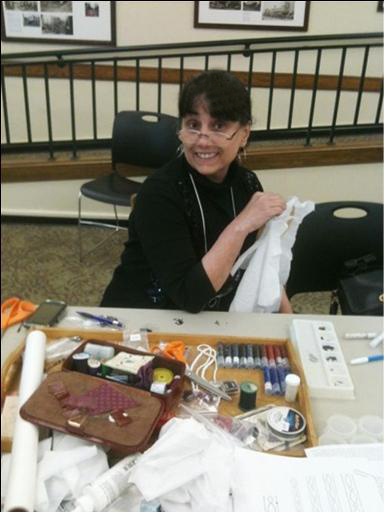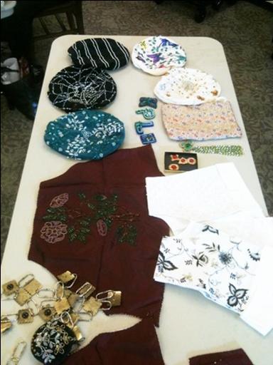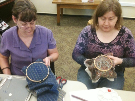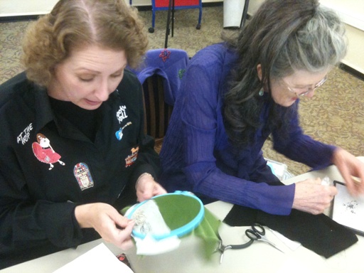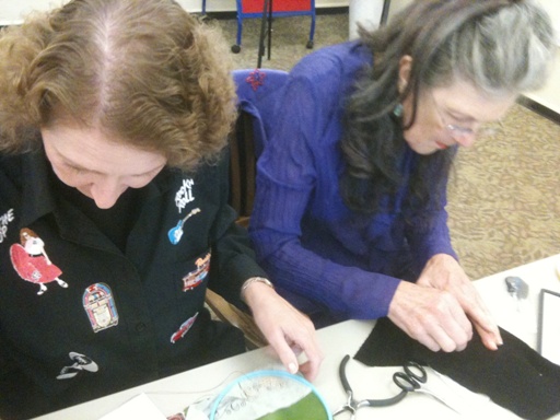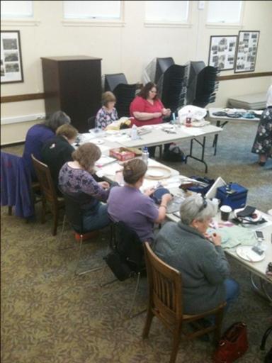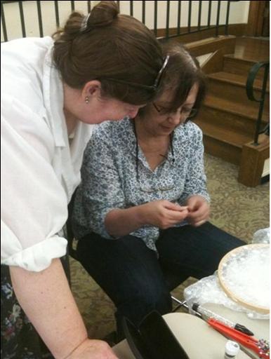 Members and friends of Somewhere in Time, Unlimited (the historical costuming club based in the Seattle, Washington area), met up one afternoon to learn how to create beautiful, beaded embellishments on fabric. The intent was to learn this technique so that it could be transferred to embellishing garments & accessories! | |