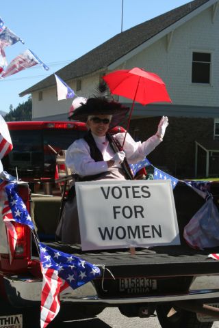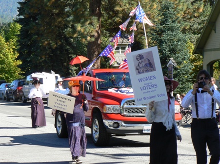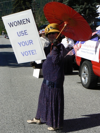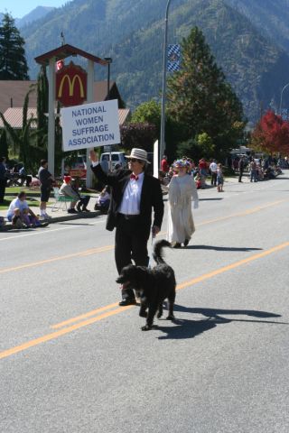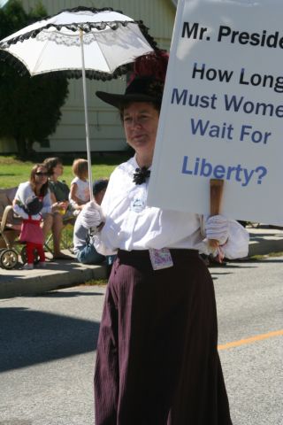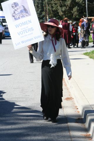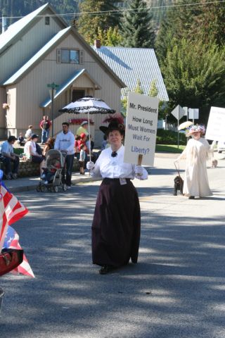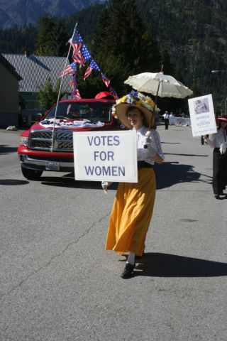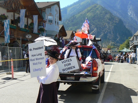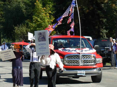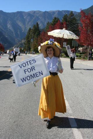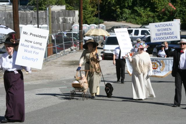 is only about 2 hours due east of Seattle. I digress. SITU had been vetted and we were invited to participate in the Grande Parade, the last Saturday of September, 2010. We always borrow the beautiful red Dodge truck from our real estate friend, Cameron West (of Prudential Mike West Realty), to use for banner display, have some members riding up on the back of the truck, etc. It was on our way literally over Stevens Pass that morning of the parade, the word came down that the driver who was to drive Cameron's truck would NOT be available. Oh dear.... Fortunately, Lady Victoria (of SITU fame) had a young cousin (Tim Brauer) visiting from Frankfurt Germany. He graciously stepped in to fill the void! Of historical significance, November of 2010, would be the centennial of the Women's Right to Vote. Female SITU members dressed as suffragettes and even had the assistance of a few husbands, willing to walk the route with them. Thus, begins our colorful story and vibrant images we wish to share... |