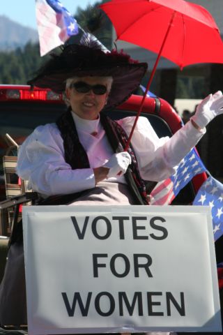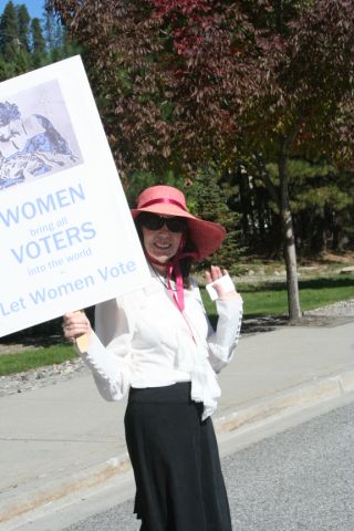 parasol and a vote encouraging other suffragettes to vote! You will notice that our red truck has been festively decked out with bunting (hood of truck) and flag pendants which are flying in the mid-day breeze.