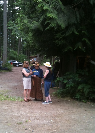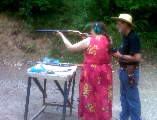 Renton Gun Club in Washington State. SASS members traditionally are dressed in Victorian attire, reflecting 1880-1899. The idea was to have the opportunity to learn more about their club, understand the process of shooting, and then be able to test the vintage looking firearms the two men had brought along. So happened, this all took place on a Friday evening after work, on a very unusually sultry, hot day in the Pacific Northwest. In the photo left, our merry group assembled near the entry of the gun club to don protective ear and eyewear... |