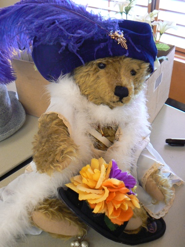Miss Vanetta strolls past with a bear she has dressed. | Here are a few of the beautiful hats Vanetta has created! |