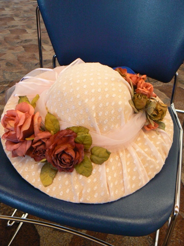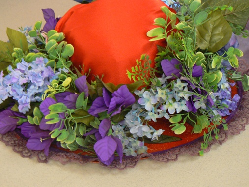 This is the finished hat of Miss Beverly. The red fabric really sets off all the lavender! Lady Victoria of Essex also decorated a hat. As it is a