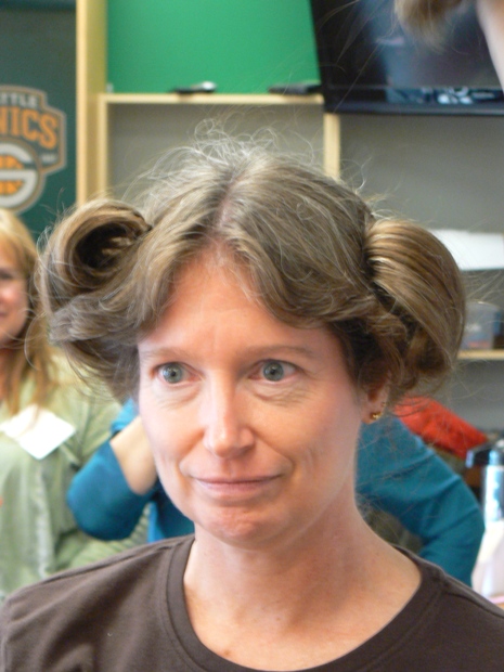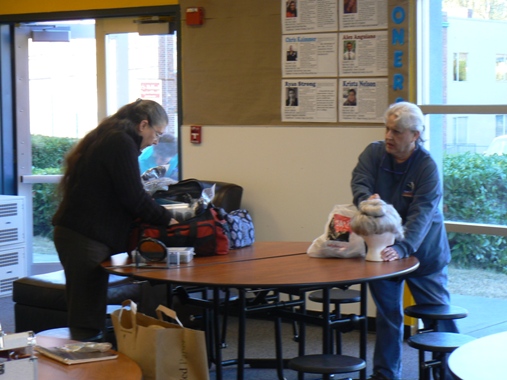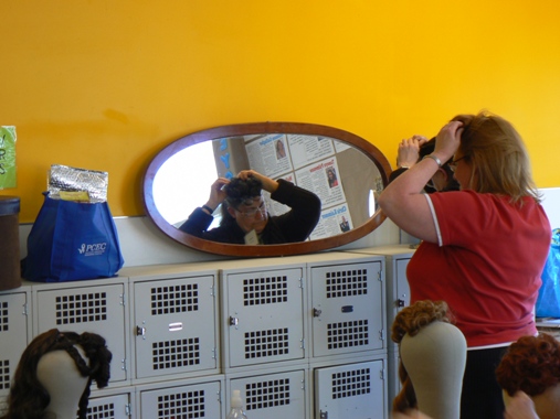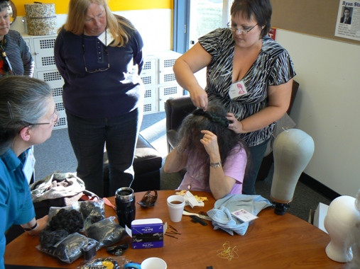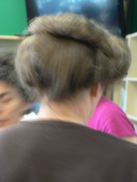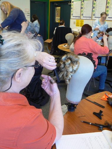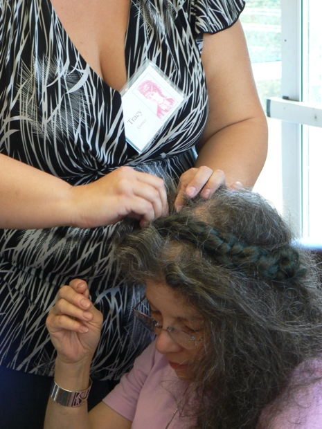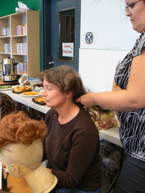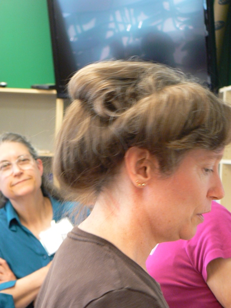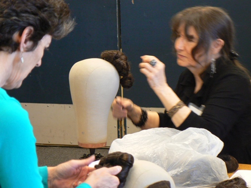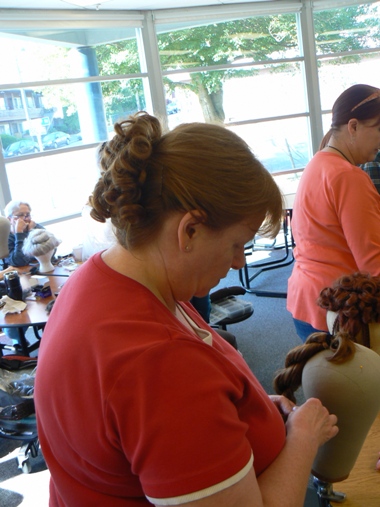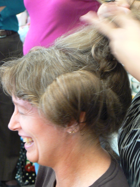 In this photo, THH is securing a Juliet bun onto the head of a participant who actually has quite short hair. THH showed us how to add