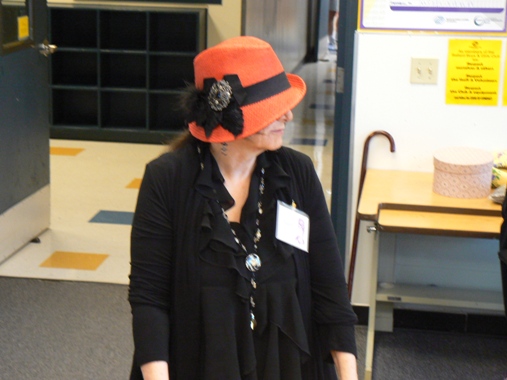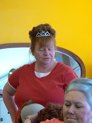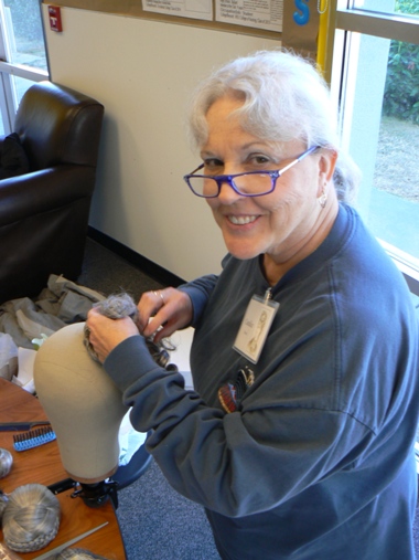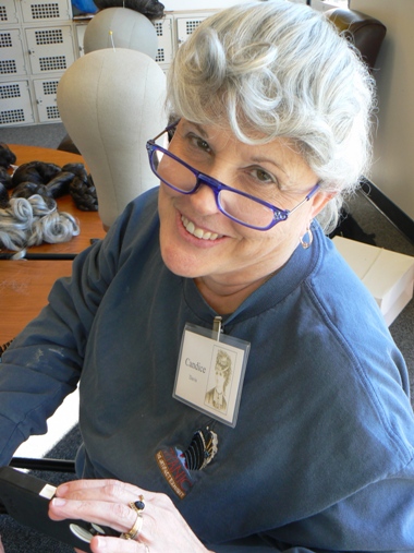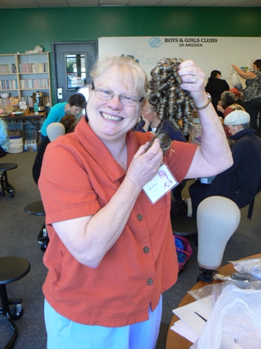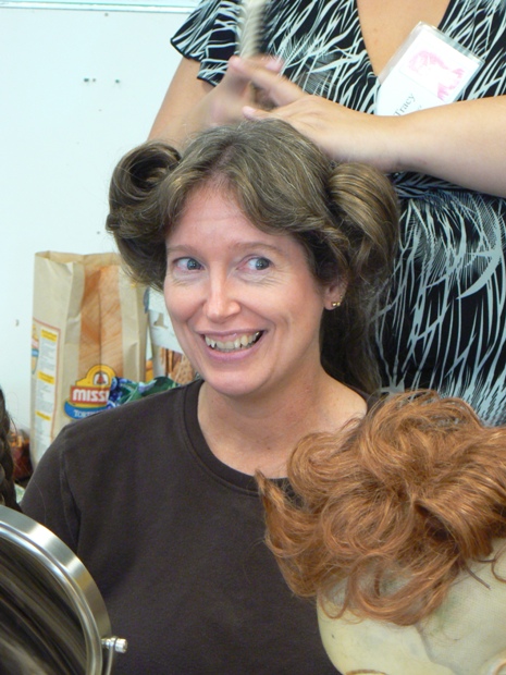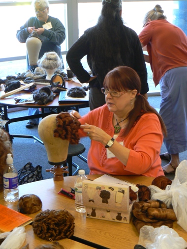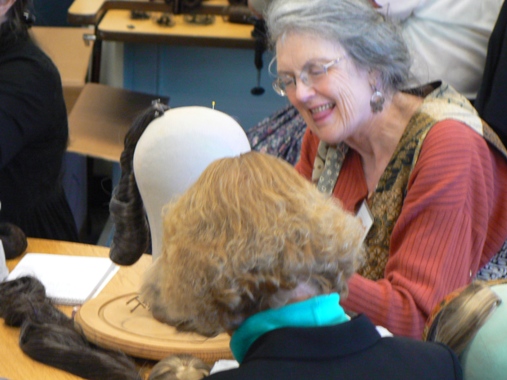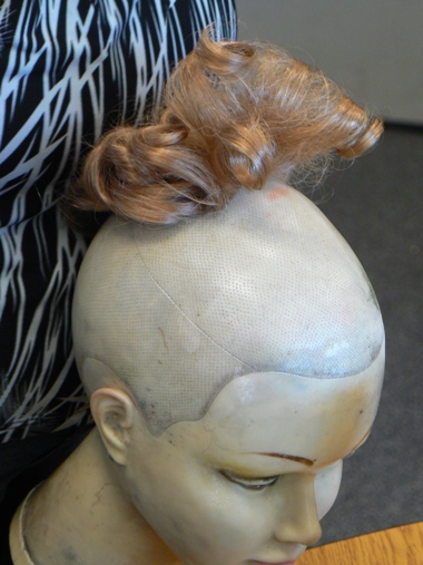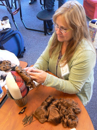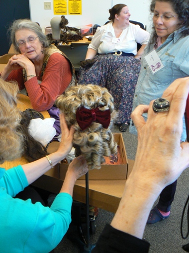 Miss Bobbie is holding up the Victorian ringlet hairpiece she ordered. I see some creative