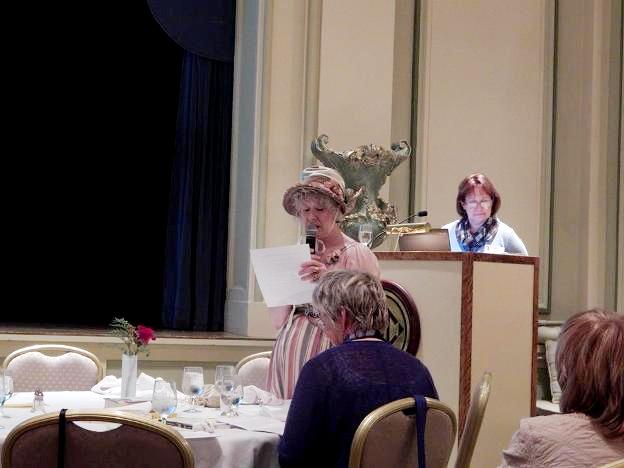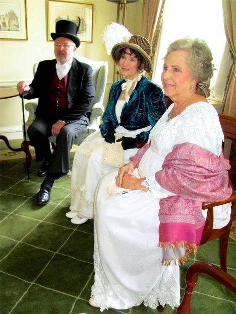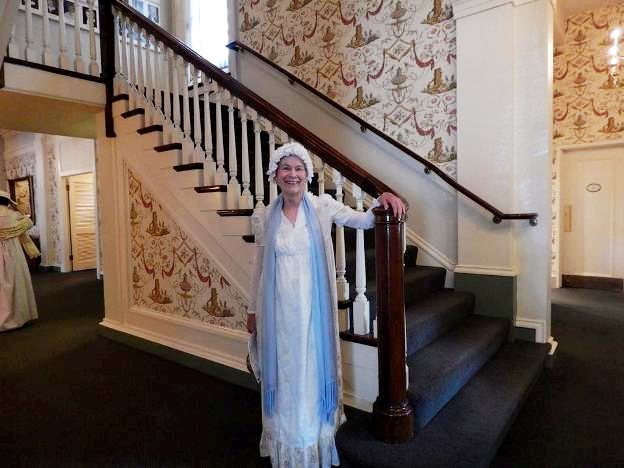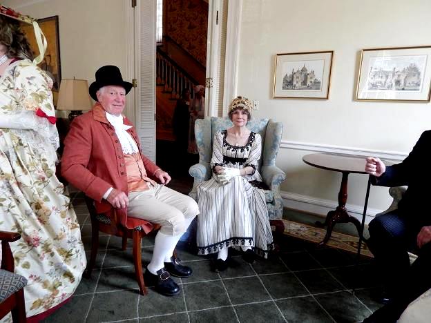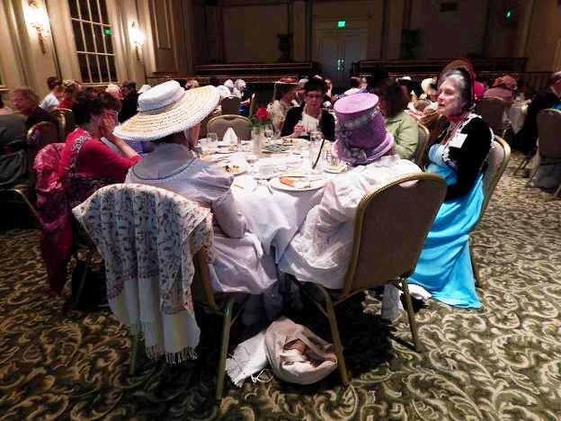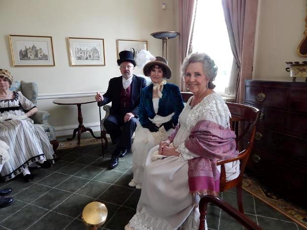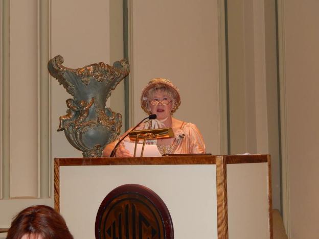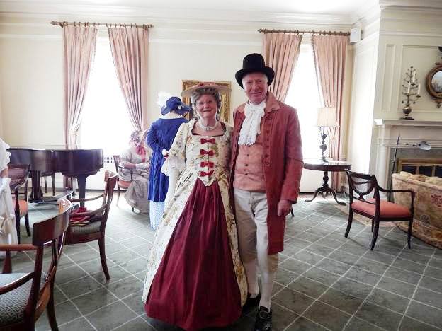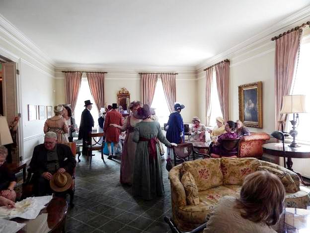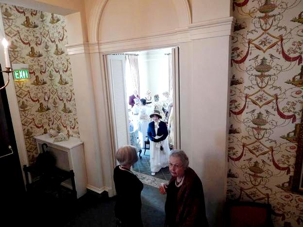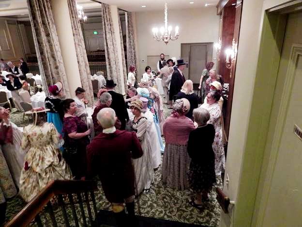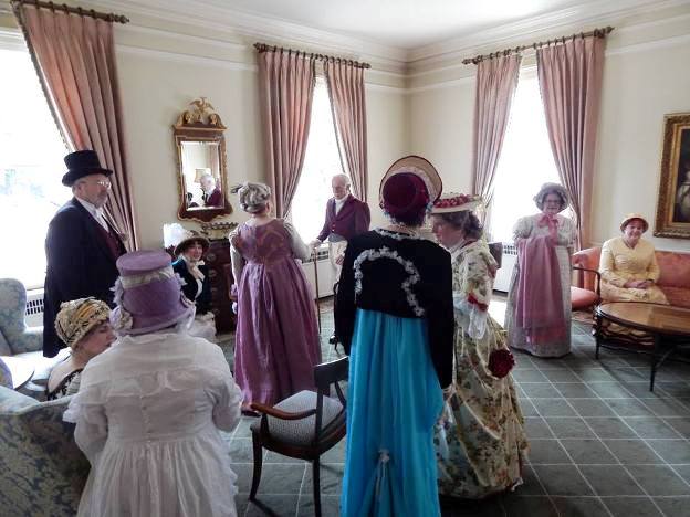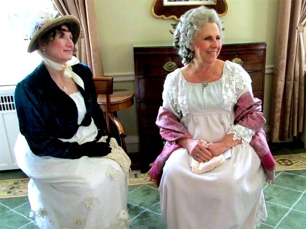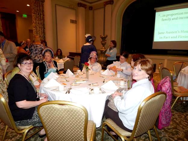 Members of Somewhere in Time, Unlimited (a historical costuming club) were invited to join the Jane Austen Society of North America (JASNA) in a Gala event. Everyone gathered in the historic Women’s University Club, a beautiful building reminiscent of an 18th c, salon. An elegant luncheon was served, with a presentation on the homes of the Regency, quizzes and prizes. Iris Lutz, current president of JASNA made a presentation on :