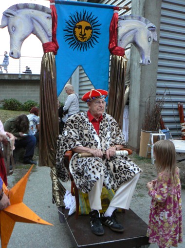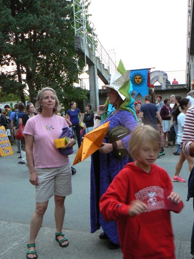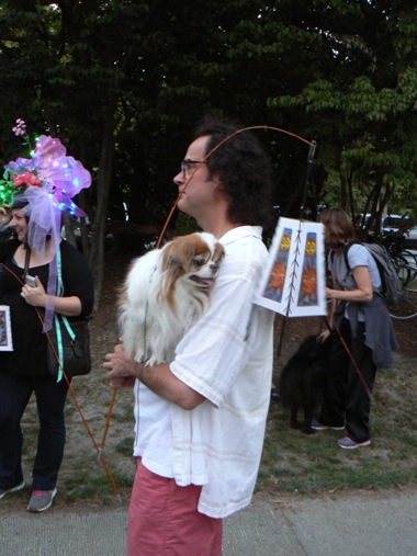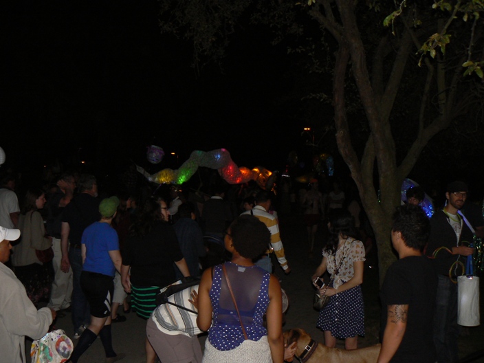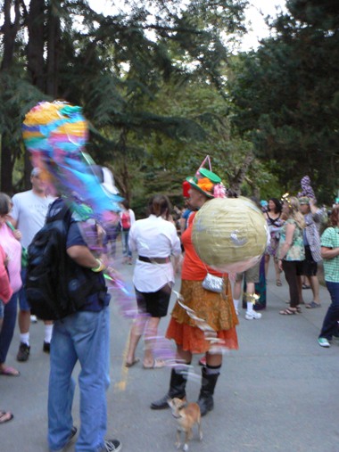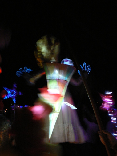 This young man with a rainbow, pinata inspired lantern with tails, could spin freely as he walked. |
