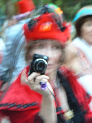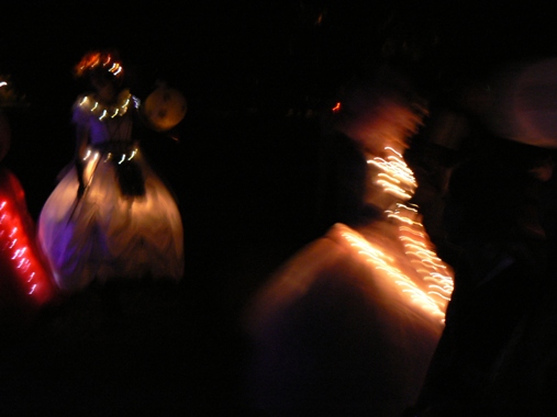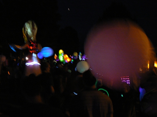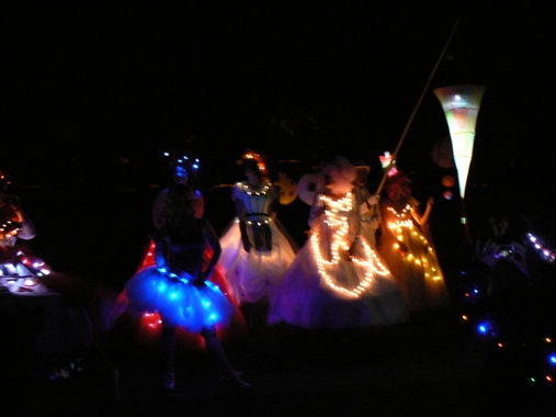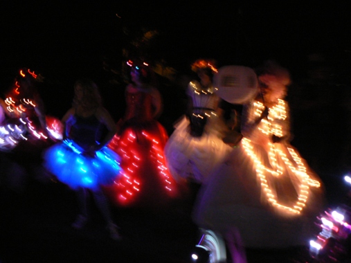 lights. We see Miss Pamela (left) whirling quickly, trying to capture images! Speaking of which, several of the photos you will be viewing may appear a bit blurry to you. That is because very few people were willing to pause long enough to take a photo. This was a massive parade with a LOT of participants! |