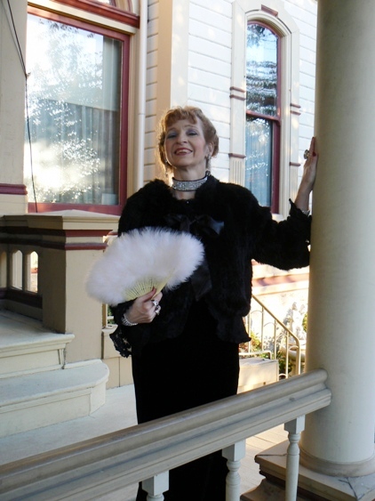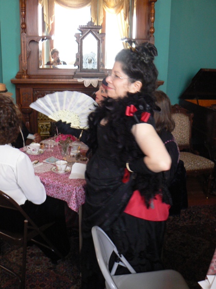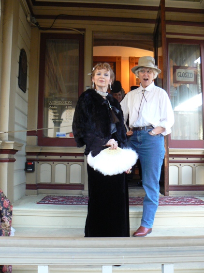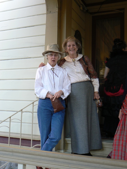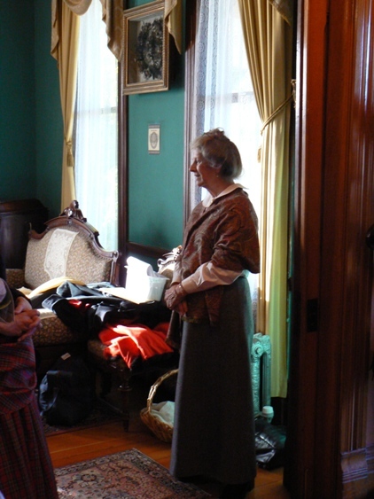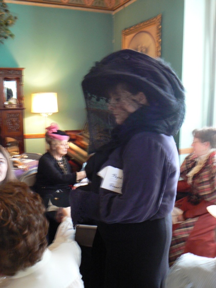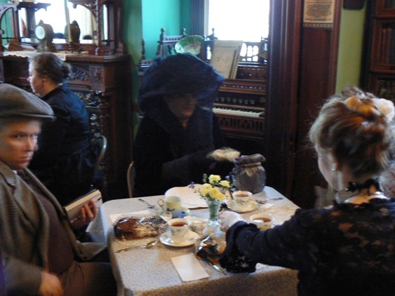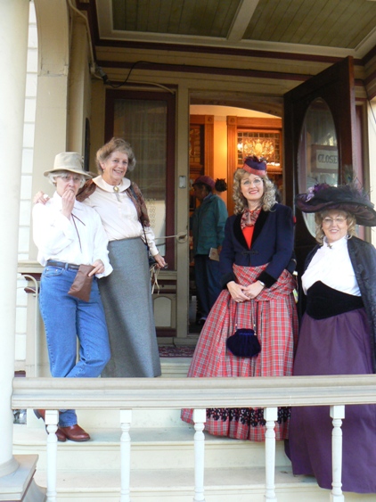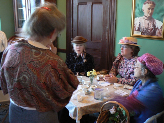 The "Psychic" wandered through the rooms announcing to everyone the clues she was being given by Ezra and Eliza Jane. | The delightful "Rosarian"(in burgundy hat) who was visiting from England, popped by to see how the roses were fairing she planted years before. | ||