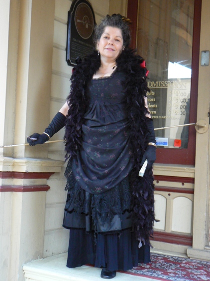 The town's "Psychic" (black veil) played a main role in the game, "channeling" the spirits of Ezra and Eliza Jane for clues throughout the afternoon. | The town's "Vet Terry" (in lace shawl) was another character everyone was wary of at various points during the game! | ||