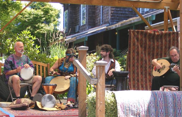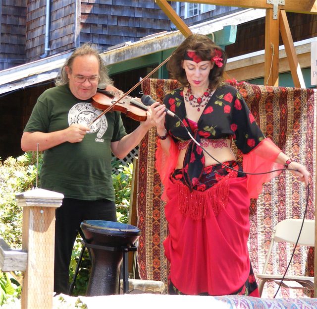 Drummers were invited to "get the show on the road" and set the tone for this elaborate event. Phil, the husband of a SITU member, can be seen above (far right) and again on the violin in the next photo with Miss Marion. She acted as organizer, M.C. and performed gypsy dances as well. |