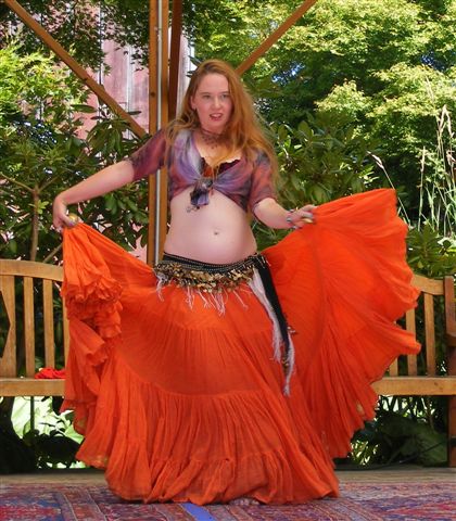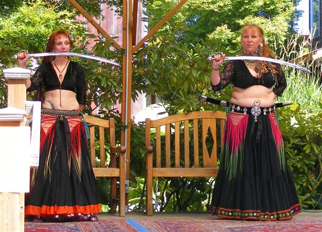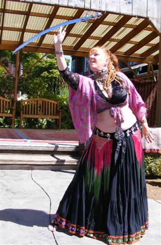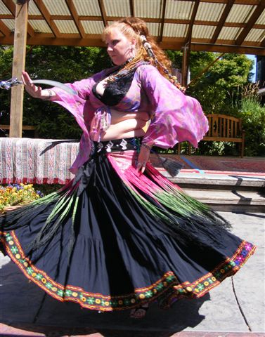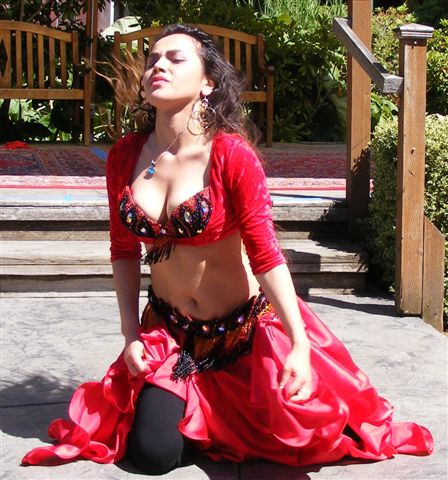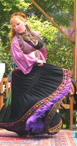 This young artist captivated the audience with her smooth moves and toss of the hair. Her costume also is interesting with the belt of beading/charms. | Here is a renowned young dancer, originally from Turkey, I believe. Guests in the audience sang along to the song she performed, clapping and encouraging. | |