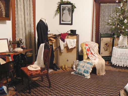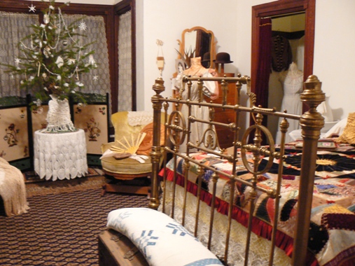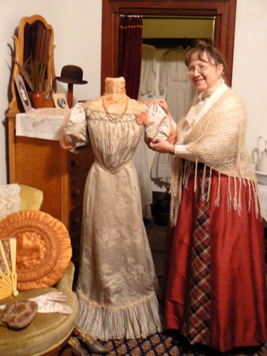 This evening dress on display, is a beautiful example of the fine collection of men and women's garments Miss Pat has amassed and puts on display at the mansion. |