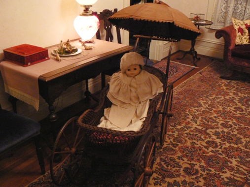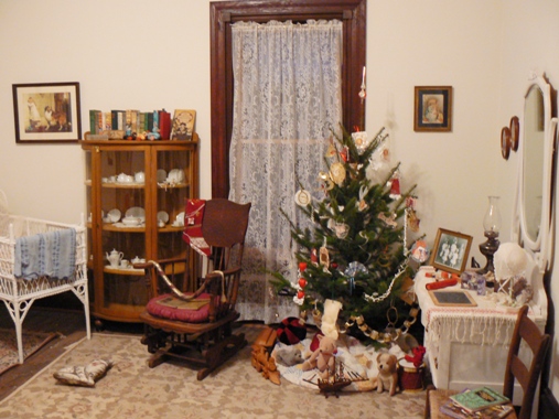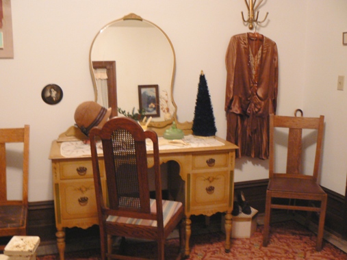 The "baby's room" was very sweet with white wicker bassinette, rocking chair, even toys under the miniature tree! | This bedroom was outfitted in "1920's style", complete with classy dresser, a dropped-waist dress and a cloche hat to top it off. | |