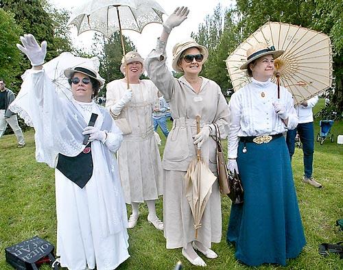 In Seattle, there is a Spring celebration called "Opening Day of Boating Season". Literally, a parade of privately and corporate-owned boats go from one of our lakes (Lake Union) thru the Montlake "cut" (which refers to a channel which was cut into the land) to the much larger lake (Lake Washington) and all the while people are waving at the boats from the shore. One can see famous vessels such as the Virginia V of "Mosquito Fleet" notoriety, sailboats, twin-engine cruisers, all the way down to little row boats. The day begins with a regatta of men's and women's crew boats coming the opposite direction thru the "cut" as they race for the final trophy of the day. Of course, members of SITU who would like to dress in period attire and greet the boats are always welcome along the shore. The group has been interviewed by the media and folks along the shore, photographed and even show in the newspapers and on T.V.! Next year, look for a group of men and women waving their hearts out and lending a festive spirit to the Opening Day!!! |