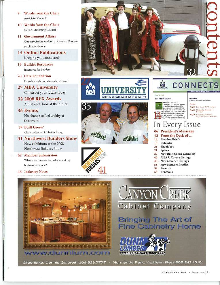 Master Builders featured Somewhere in Time, Unlimited in their August 2008 issue of "Master Builder", the official publication of the MBA of King and Snohomish Counties. Wanna see? |