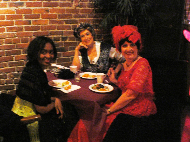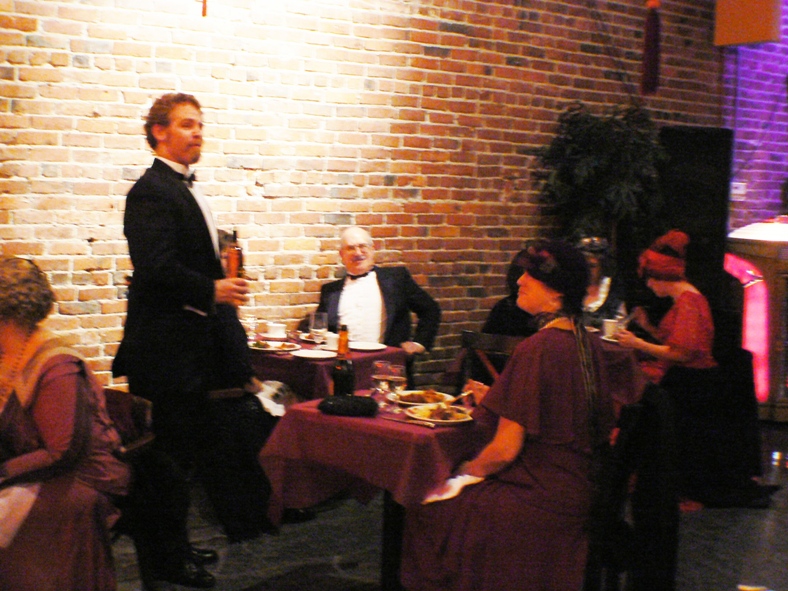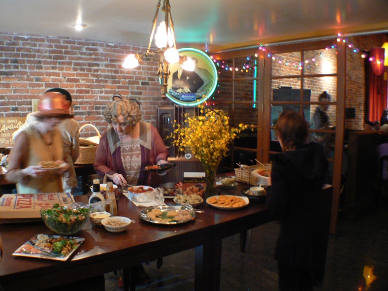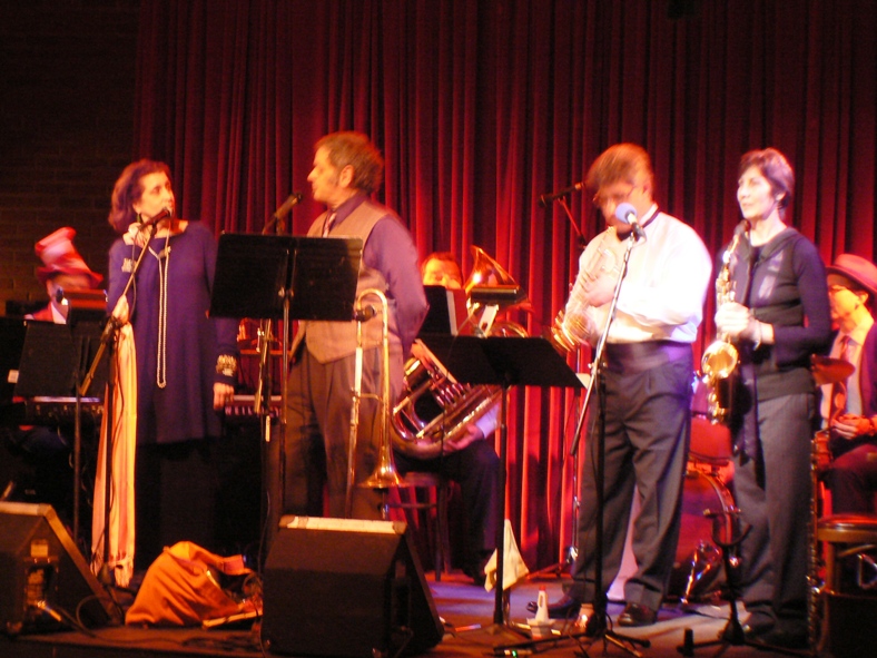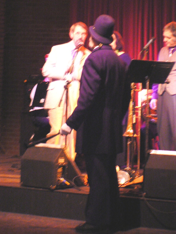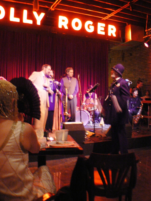 The evening started off with a lovely potluck buffet followed by Rose welcoming people to the party, giving fair warning to everyone about "Da e-muuuurgency exits" just in the event that "Da Coppers rush in ta BUST da joint"! Rose then began singing of her situation as the notoriously named "Second Hand Rose" and then ended her delivery from the stage by introducing The Chicago 7 of local fame. |