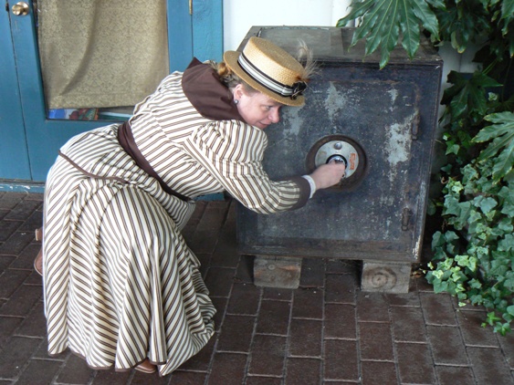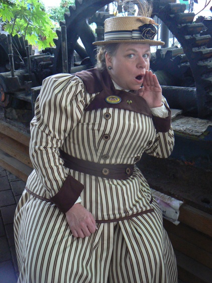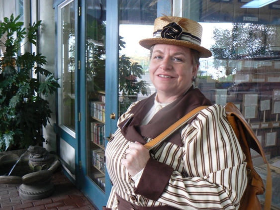 neighborhood to take in a very special play. Here, Miss Agnes waits in the courtyard of History House. She is wearing a wonderful outfit, ideal for bicycling! |