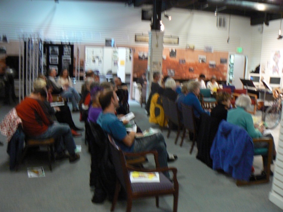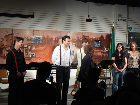The lovely dark-haired woman (Kelly Kitchens)was a supporting actor in the play. The blond woman on the right, (Annie LaReau) represented Book-It Theatre. Annie thanked everyone for attending and encouraged us to come to other performances they offer, based on great books. |
