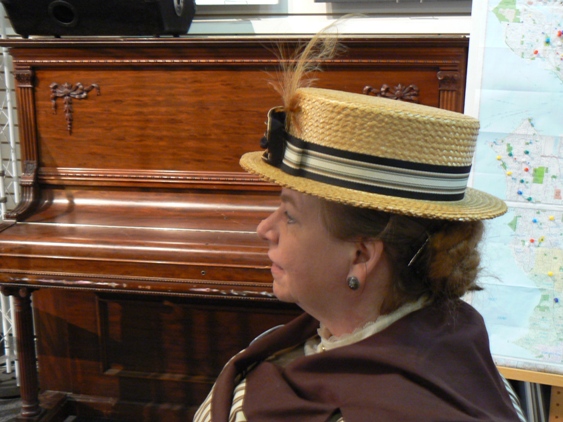 The play was well attended with all the seating taken on 3 sides of the stage! | Here, Miss Agnes has found her seat with an excellent view. Vintage piano in background. |