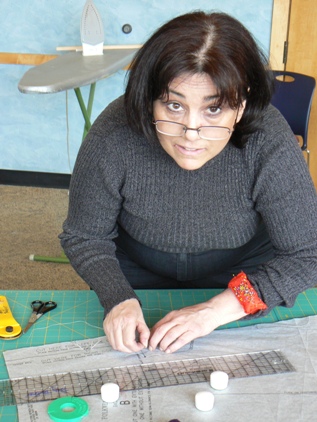 Miss Judy looks up from her own pattern adjustments. |